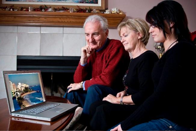 Tom Gougeon, Susan Hutton and Barb Scott look over one of the pictures they placed on the website to show a view from Apartment 7B in San Juan Puerto Rico.