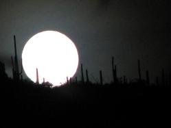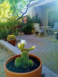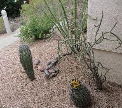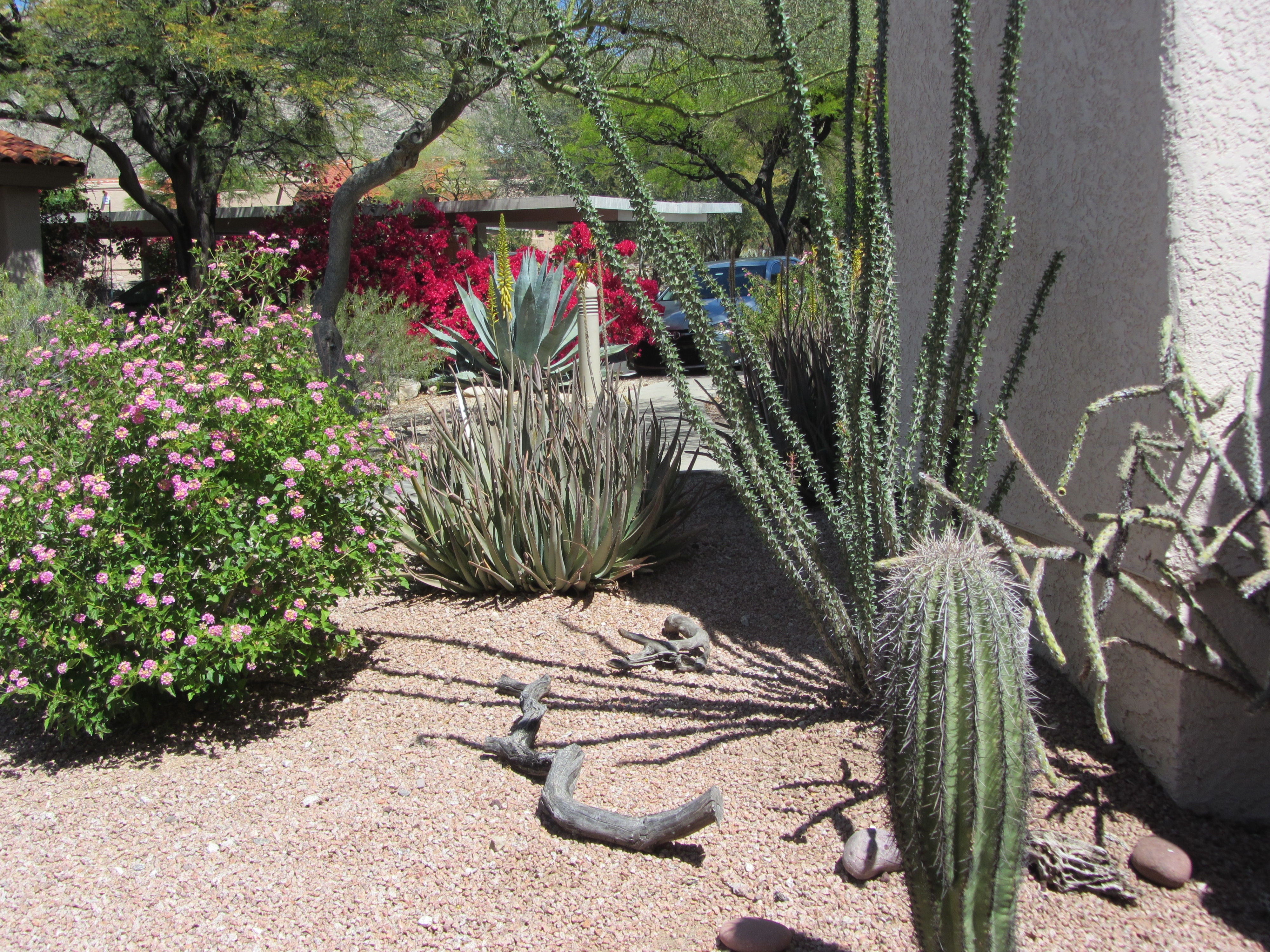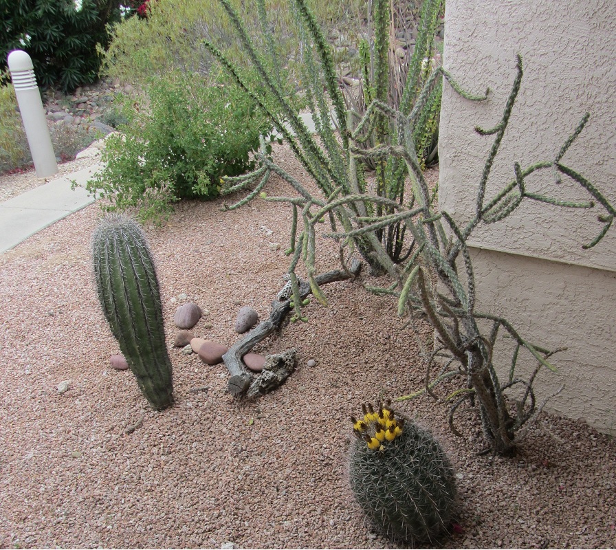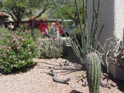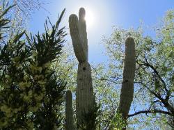 surrounded by mature Saguaro cacti and flowering